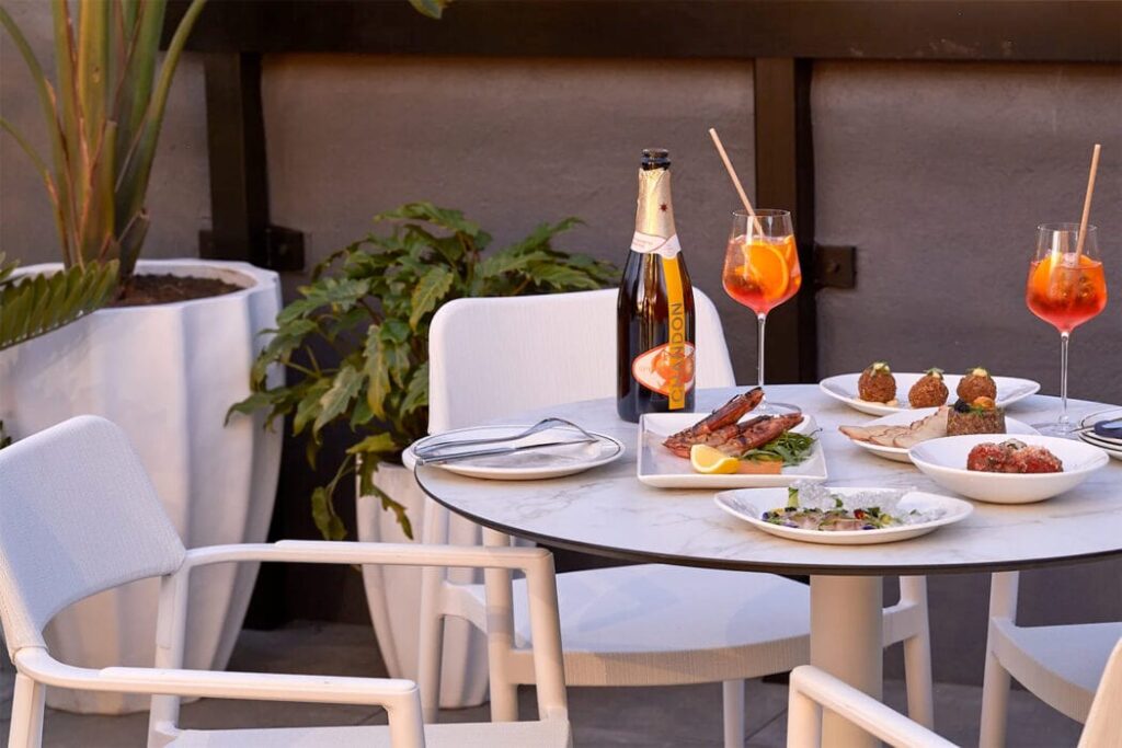 Level one sets the scene for social drinks and bites for up to 50 guests. With azure velvet banquette-lined walls, marble fireplace, charcoal oak furniture and herringbone flooring, the space is complemented by copper detailing that glows under the canopy light installation, hand-crafted with 500 suspended bottles. The sunlit rooftop reveals a vertical garden, elegant bianco alfresco settings, Golden Onyx bar and an all-season retractable roof for up to 60 guests to enjoy sunset cocktails and plates of Antipasto.