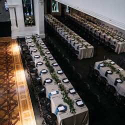 Experience a beauty and serenity rarely found at an event venue. The wall sconces cast a warm and ambient glow, enhancing the room’s inviting atmosphere along with the venue’s timeless original features – from the magnificent marble verandah and soaring ceilings rising above a grand intricate parquetry dance floor to the carved staircase and hand painted stained glass windows —backlit in the evenings—creating a breathtaking backdrop for dining and dancing with your guests.