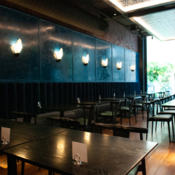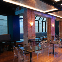 Our Main Dining Room features pressed metal ceiling, Tiffany wall sconces, blue velvet booth seating and custom venetian plaster walls. Perfect for corporate seated functions with our 3 course set menu.