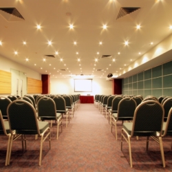 The room comes equipped with a projector and a large screen, which is great for presentations and visual displays. This setup ensures that everyone in the room can see and hear clearly, making it ideal for any event where visual and audio elements are key.